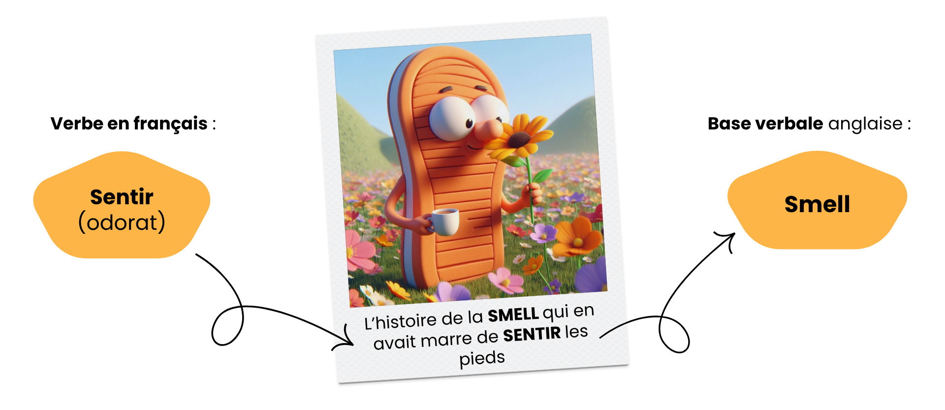 L’histoire et l’image agissent comme un chemin mental qui te mène du verbe en français vers la base verbale en anglais :